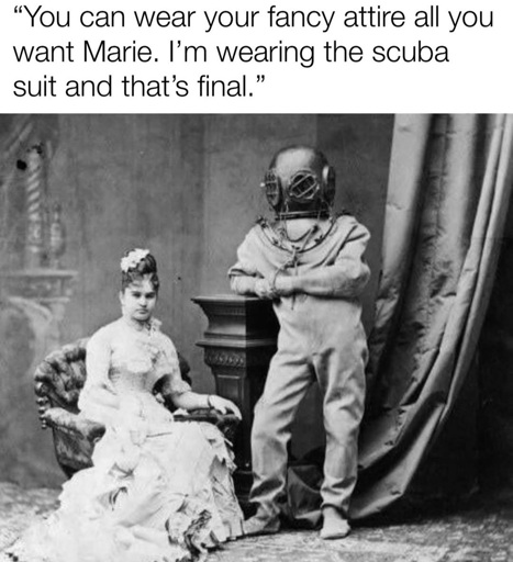 Plot twist they are underwater and she is the one being stubborn about the outfit.