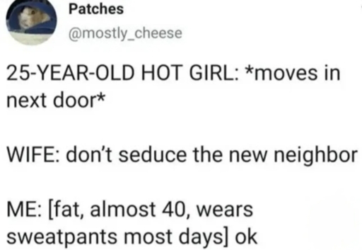 Plot twist: new neighbor was wearing a shirt that read, “I <3 dad bods,” and was already flirting (asking for help moving boxes /eyeroll) with the guy in sweatpants.
