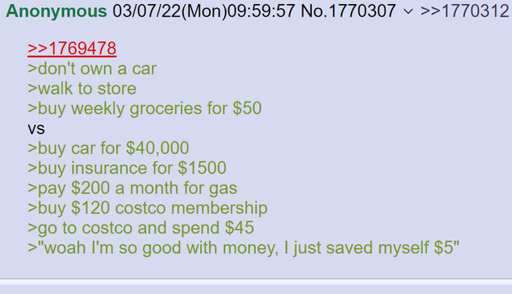 Yeah, that would be a great point if the entire post wasn’t a 4Channer framing this as personal choices and not systemic ones. The dudes not talking about how the car industry destroyed railcars, he’s dunking on people who drive to the grocery store, and the implication is clearly, “everyone can and should do this,” which is bullshit.
