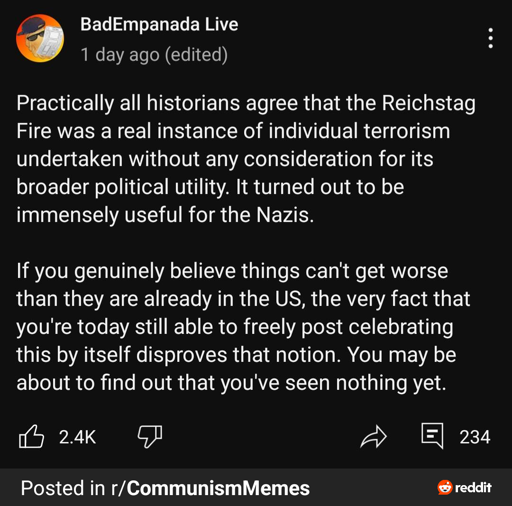 What the utility in saying this? I mean yeah, no shit, things can get worse but they actively have been getting worse for a very long time now. Right wingers being genuinely scared is a good thing. You should be scared to hold hateful beliefs