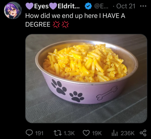 Oh shit, didn’t even notice it’s a dog bowl, I thought it was a commentary on not being able to affort better food.