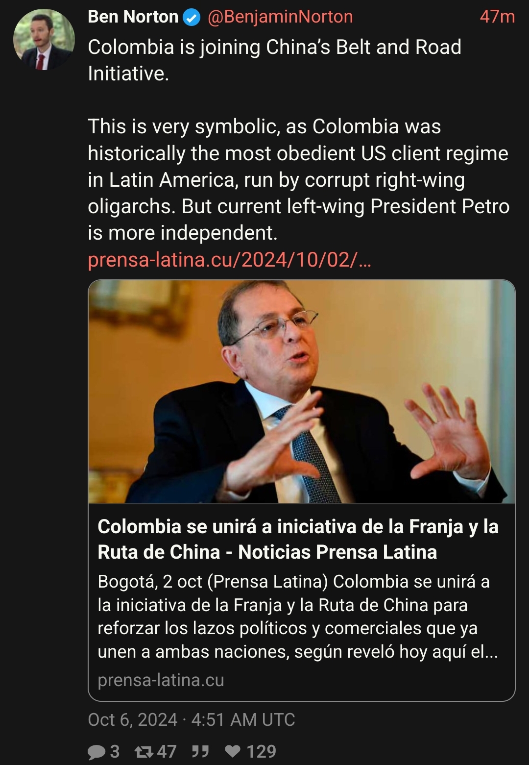 Southern Boy@lemmy.ml to World News@lemmy.ml · 1 year agoColombia, historically the most obedient US client regime in Latin America, is joining the Belt and Road Initiative!lemmy.mlimagemessage-square35linkfedilinkarrow-up190file-text